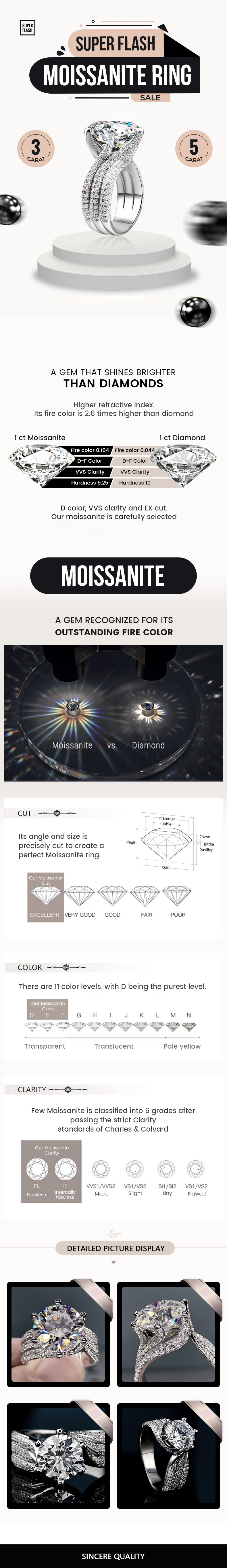 - Oversized super sparkling moissanite diamond ring, refined and timeless design aesthetic enhances any casual or elegant formal attire, making you the focal point of banquets, dates, prom parties, travel, Christmas, birthdays.